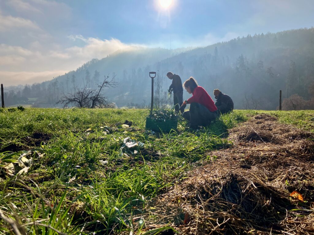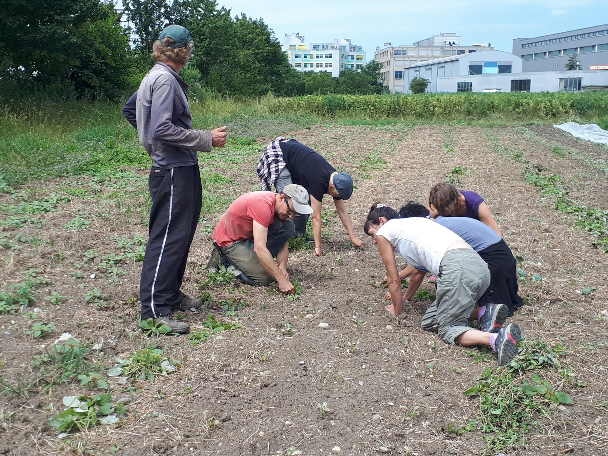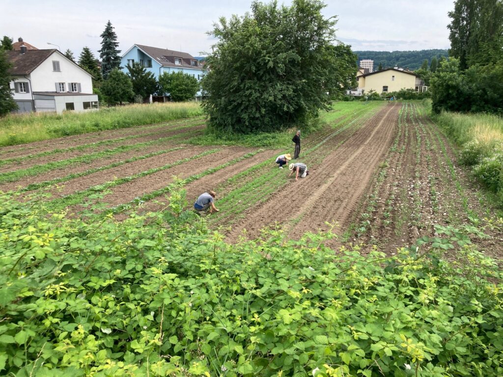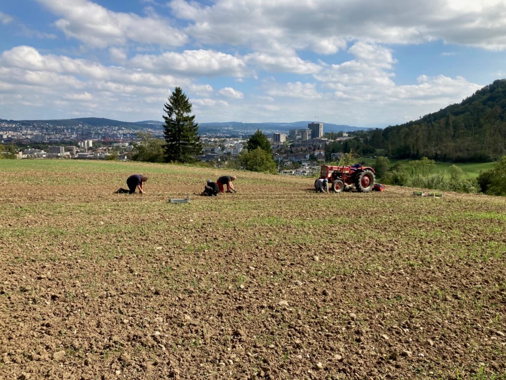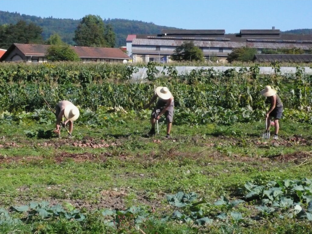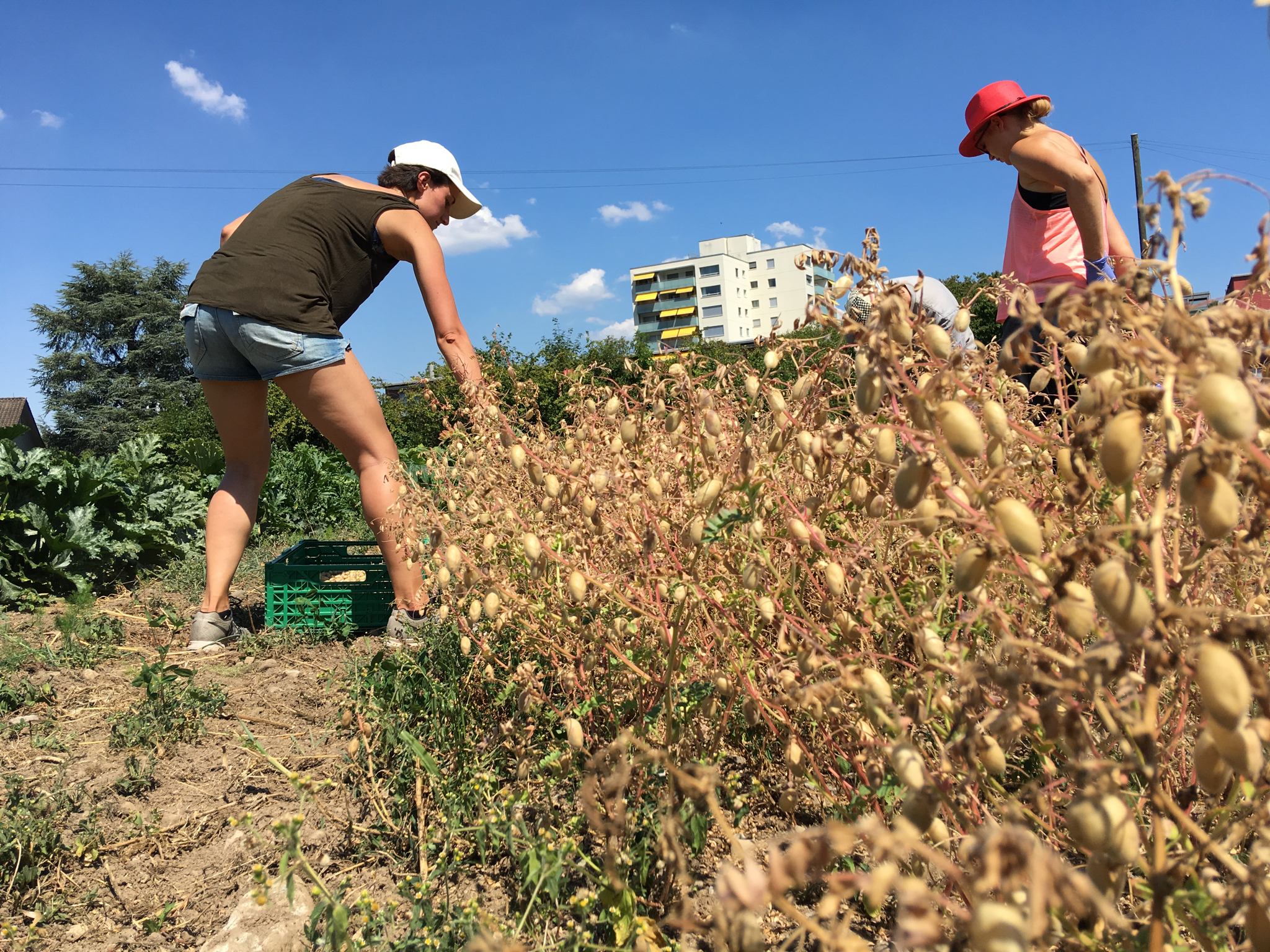 Grosse Pause im Obst- und Beerengarten Herrenbergli.Tunnelgerüst VerschiebeaktionKichererbsenernte.Urbarmachung von totem Boden.Naschen im Obst- und Beerengarten Herrenbergli.Bücken und niederknien im Ifang, Schlieren.Rossmist schippen.