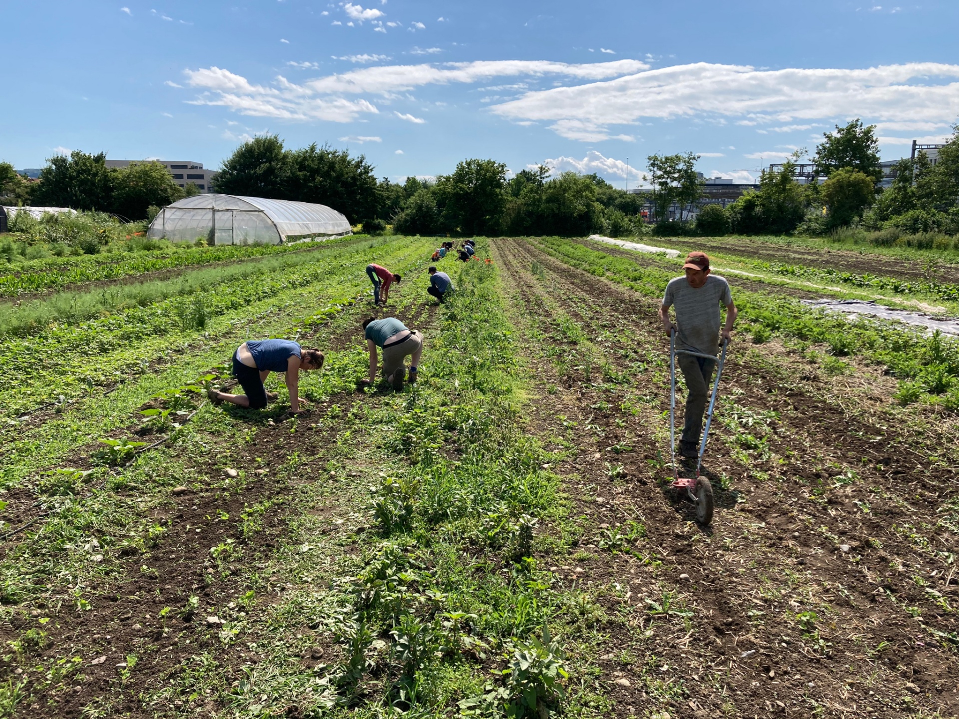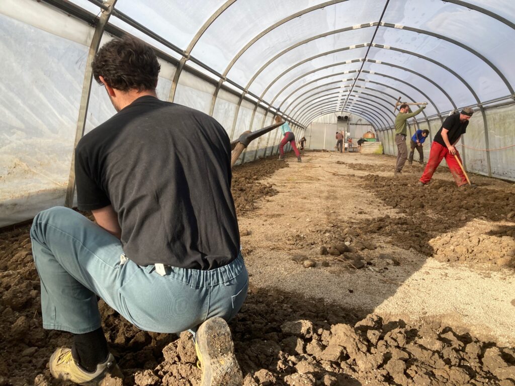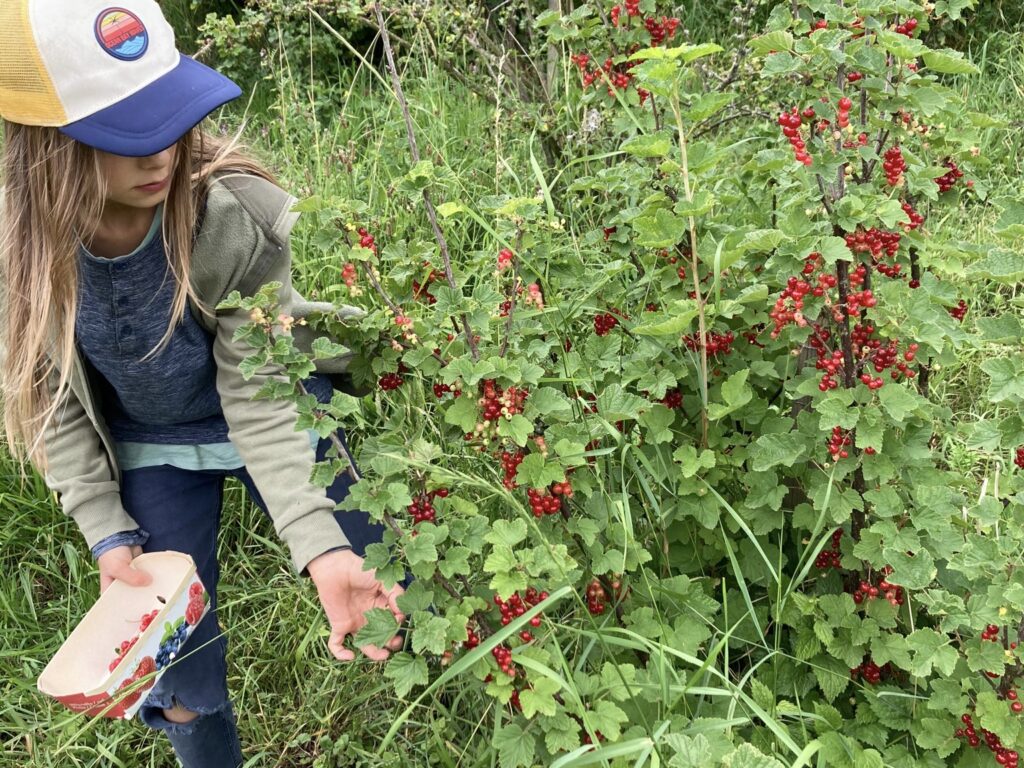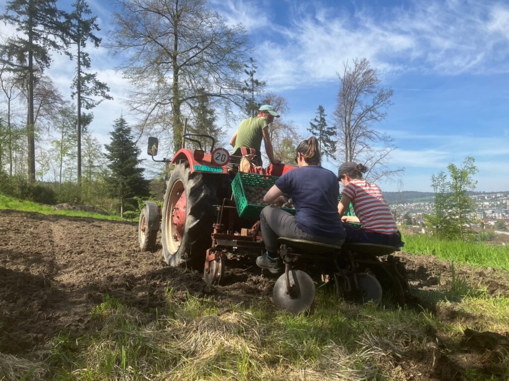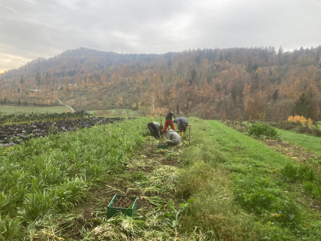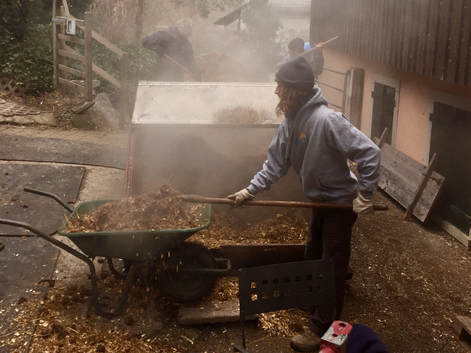 Grosse Pause im Obst- und Beerengarten Herrenbergli.Tunnelgerüst VerschiebeaktionKichererbsenernte.Urbarmachung von totem Boden.Naschen im Obst- und Beerengarten Herrenbergli.Bücken und niederknien im Ifang, Schlieren.Rossmist schippen.